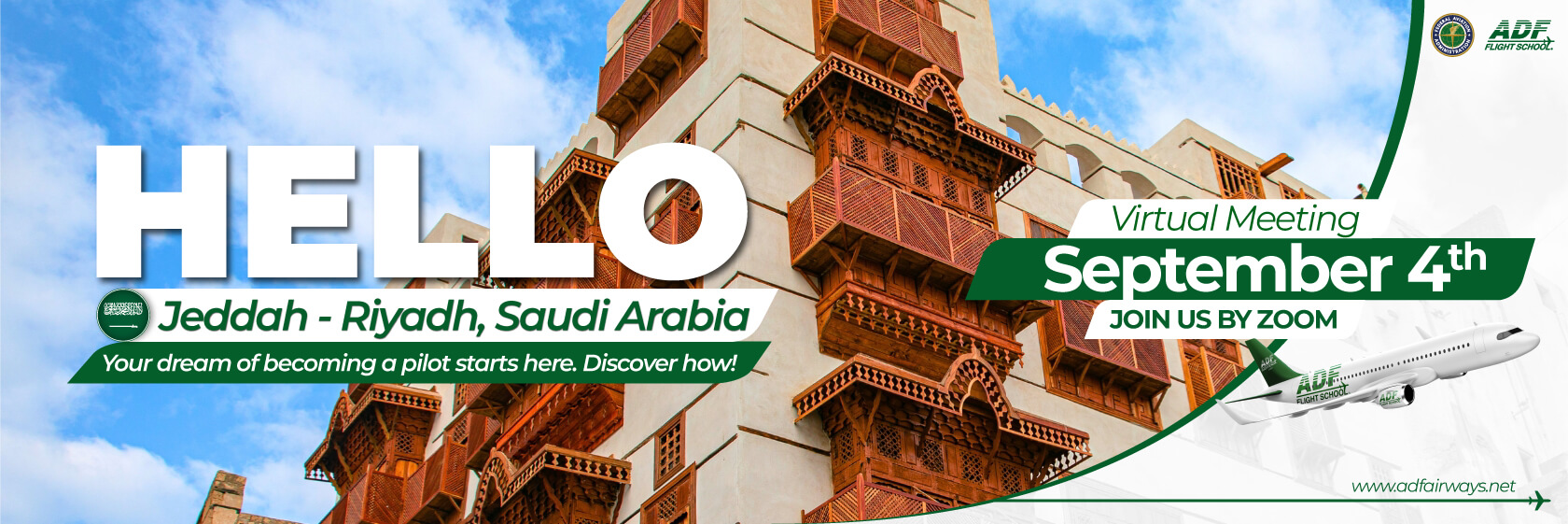 ADF Flight School, based in Miami, Florida, invites aspiring pilots from Jeddah and Riyadh, Saudi Arabia to a special virtual session. Learn about our FAA-certified training programs, international career opportunities, and how you can become a professional airline pilot.